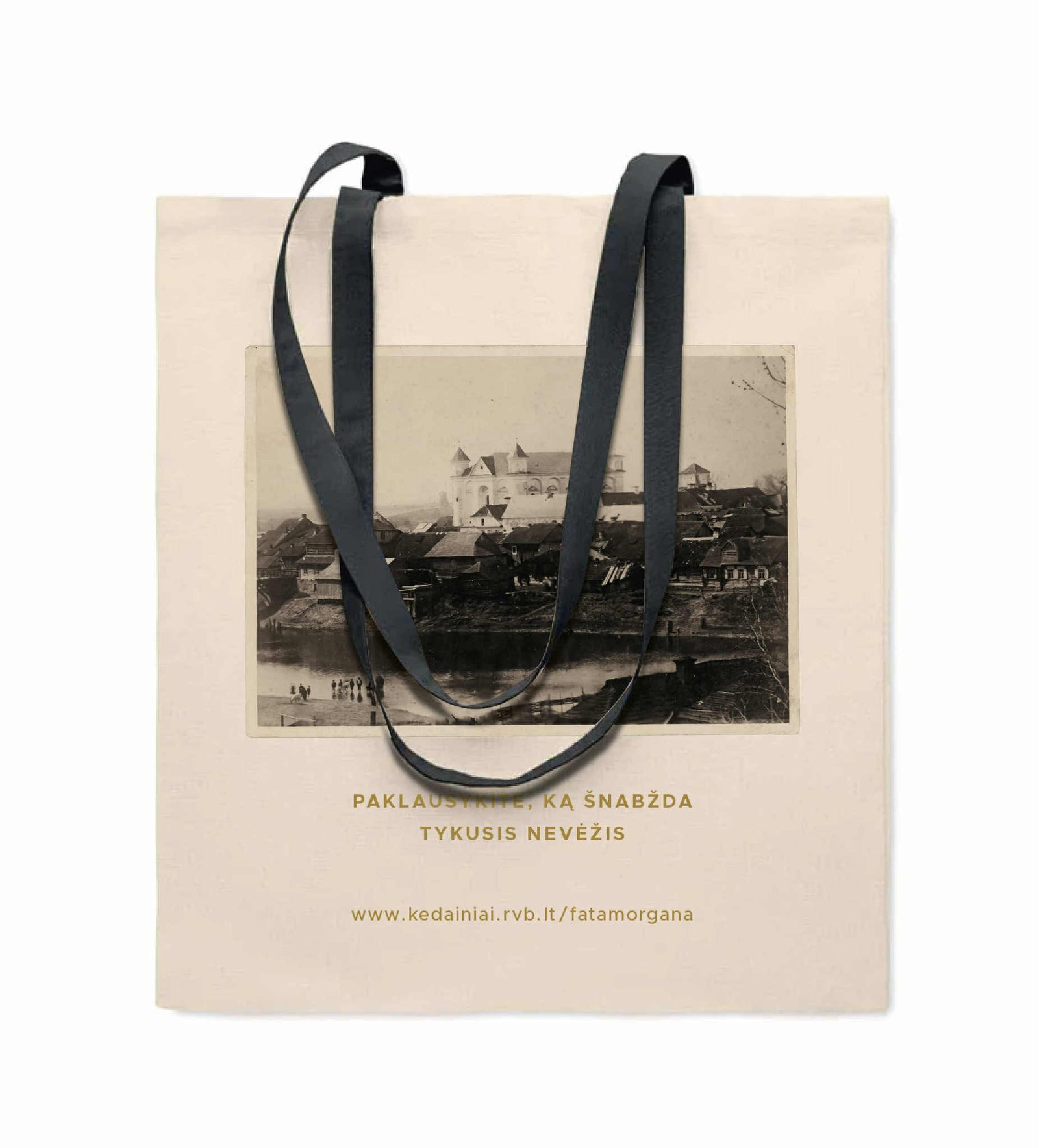 Stilingas drobinis maišelis literatūros ir kultūros mylėtojams. Vienoje pusėje – reprezentacinė „FATA MORGANA“ knygos spauda, kitoje – Kėdainių reformatų bažnyčios atvaizdas, simbolizuojantis miesto istoriją ir kultūrinį paveldą.